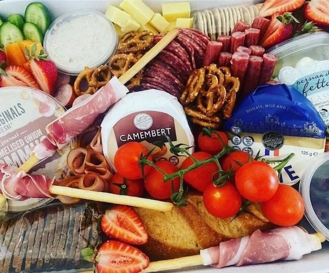 Savoury - Mix meats, antipasto, gourmet biscuits, fresh fruit, cheeses and dips